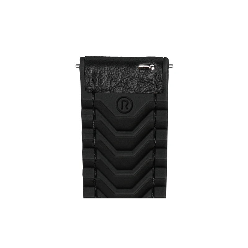 Jedro pasu je izdelano iz NBR gume, ki je oblikovana z integriranimi zračnimi kanali za učinkovito odvajanje toplote in vlage. Ta konstrukcija omogoča boljše zračenje med nošenjem in prispeva k stabilnemu občutku na zapestju tudi pri daljši ali bolj aktivni uporabi. Zgornji del pasu je iz bikovskega usnja polne zrnatosti, mat obdelave, ki ohranja naravno teksturo in robusten videz.