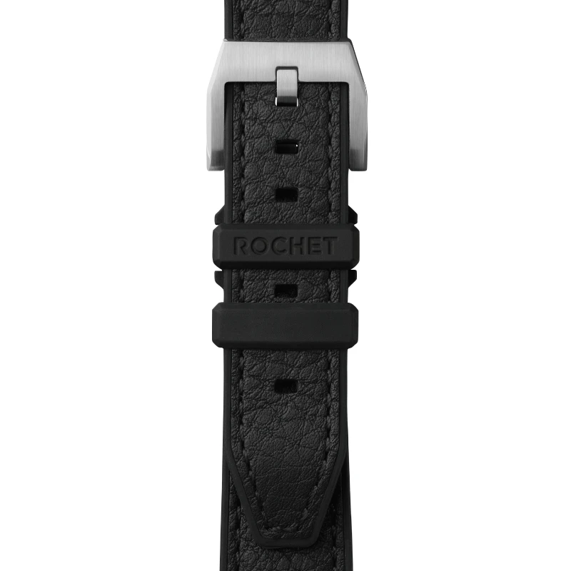 Opremljen je z zaponko iz nerjavečega jekla 316L, ki združuje satenasto brušeno in sijajno obdelavo. Sistem D’CLIC omogoča hitro in enostavno namestitev pasu brez uporabe orodja. Model 8512201 je izveden v črni barvi (Noir Black) in spada v linijo ROCHET Hybrid.