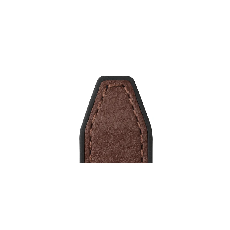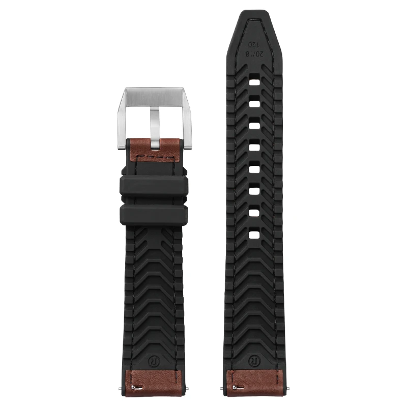 Jedro pasu je izdelano iz NBR gume, ki je oblikovana z integriranimi zračnimi kanali za odvajanje toplote in vlage. Takšna zasnova omogoča boljše zračenje notranje strani pasu in stabilen stik z zapestjem tudi pri daljšem nošenju. Zgornji del je iz bikovskega usnja polne zrnatosti, mat obdelave, z jasno vidno naravno teksturo, ki poudarja robusten in tehnično-navdihnjen značaj pasu.