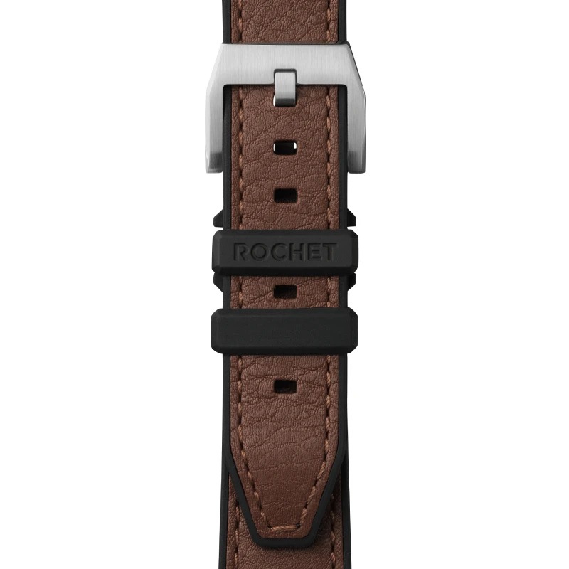 Opremljen je z zaponko iz nerjavečega jekla 316L, ki združuje satenasto brušeno in sijajno obdelavo. Sistem D’CLIC omogoča hitro in enostavno namestitev pasu brez uporabe orodja. Model 8512203 je izveden v barvi Vison Brown (03) in spada v linijo ROCHET Hybrid.