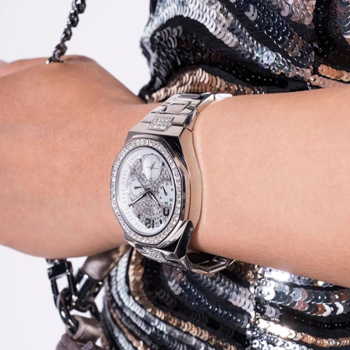 Srebrna številčnica je bogato okrašena s kristali, ki dopolnjujejo prepoznavno zasnovo ure. Mineralno steklo ščiti površino pred praskami in zagotavlja dobro berljivost.