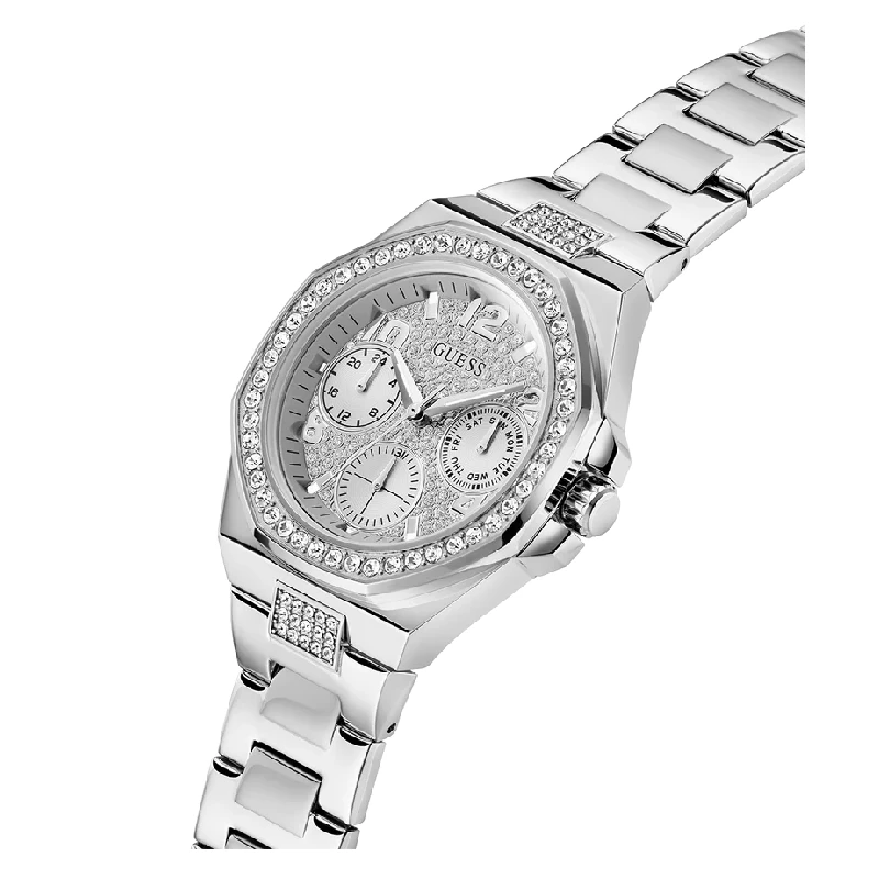 Guess GW0777L1 – ženska ura iz recikliranega nerjavečega jekla v srebrnem tonu. Ohišje premera 40 mm ustvarja izrazit in uravnotežen videz, kovinska zapestnica širine 22,5 mm pa se barvno ujema s številčnico in je opremljena z zaponko tipa pilot za varno zapenjanje.