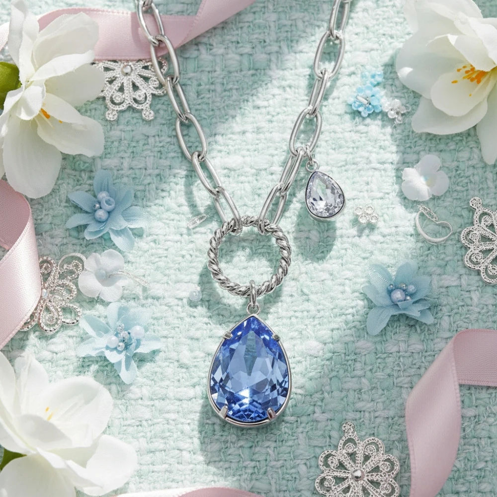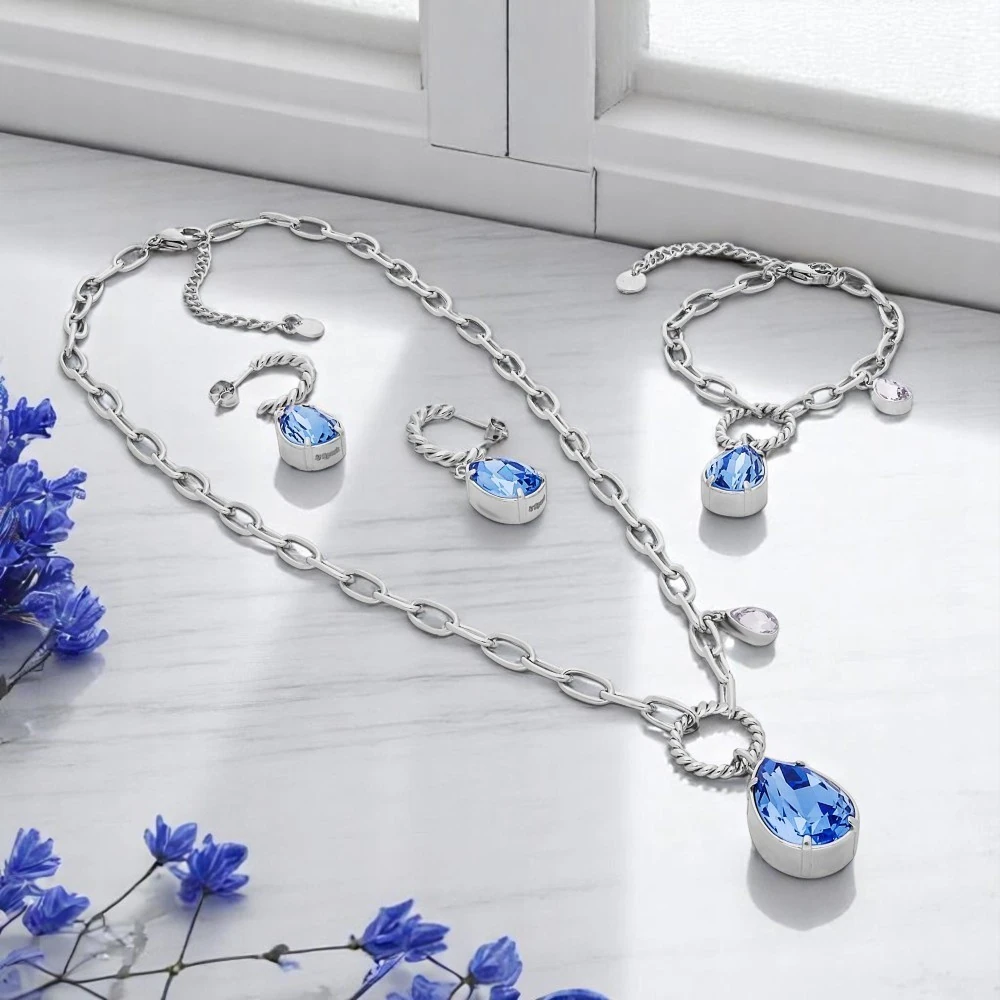 Verižica SPARK Illusion SN432018IB s kristali Swarovski združuje sodoben industrijski dizajn z nežnim leskom kristalov. Na izraziti verižici iz nerjavečega jekla visi prepleten obroč, iz katerega se spušča modri kapljičasti kristal Swarovski (18 mm), poleg njega pa diskretno visi še manjši svetlo moder kristal, ki ustvarja zanimivo dvojno dinamiko.